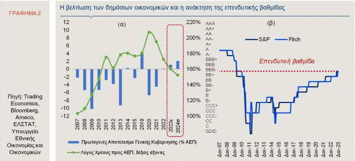 Η εκτιμώμενη διατήρηση των πρωτογενών πλεονασμάτων και οι αναμενόμενοι θετικοί ρυθμοί οικονομικής μεγέθυνσης διασφαλίζουν την περαιτέρω αποκλιμάκωση του λόγου χρέους προς ΑΕΠ. Τούτο, σε συνδυασμό με τα ευνοϊκά χαρακτηριστικά του δημοσίου χρέους (σταθερά και χαμηλά επιτόκια, υψηλή μέση σταθμική διάρκεια) αποτέλεσαν, μεταξύ άλλων, βασικούς παράγοντες για την ανάκτηση, μετά από 13 χρόνια, της επενδυτικής βαθμίδας για το αξιόχρεο της Ελληνικής Δημοκρατίας από τους οίκους πιστοληπτικής αξιολόγησης S&P και Fitch (Γράφημα 2β).