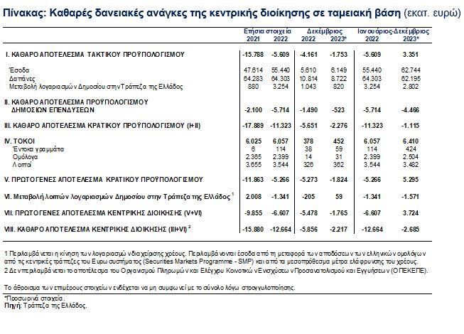 Μειώθηκε το ταμειακό έλλειμμα της κεντρικής διοίκησης την περίοδο Ιανουαρίου - Δεκεμβρίου 2023 καθώς διαμορφώθηκε στα 2.685 εκατ. ευρώ, έναντι ελλείμματος 12.664 εκατ. ευρώ την αντίστοιχη περίοδο του 2022. Κατά την περίοδο αυτή, τα έσοδα του τακτικού προϋπολογισμού διαμορφώθηκαν σε 62.744 εκατ. ευρώ, από 55.440 εκατ. ευρώ πέρυσι. Όσον αφορά τις δαπάνες του τακτικού προϋπολογισμού, αυτές διαμορφώθηκαν σε 62.195 εκατ. ευρώ, από 64.303 εκατ. ευρώ την περίοδο Ιανουαρίου - Δεκεμβρίου 2022. Το ταμειακό πρωτογενές πλεόνασμα διαμορφώθηκε στα 5,295 δισ. έναντι πρωτογενούς ταμειακού ελλείμματος 5,266 δισ. το 2022.