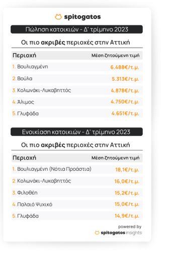 Τα Νότια και τα Βόρεια Προάστια της Αττικής καθώς και οι Κυκλάδες βρίσκονται ανάμεσα στις πιο ακριβές περιοχές της Ελλάδας για αγορά και ενοικίαση κατοικιών το τέταρτο τρίμηνο του 2023, με τα Νότια Προάστια να σημειώνουν την υψηλότερη μέση ζητούμενη τιμή πώλησης κατοικίας πανελλαδικά. Ανάμεσα στις πιο ακριβές περιοχές για αγορά κατοικίας περιλαμβάνεται και o Δήμος Θεσσαλονίκης, ενώ ενδιαφέρον προκαλούν και οι αυξημένες μέσες ζητούμενες τιμές πώλησης στα νησιά του Ιονίου, όπου η μέση ζητούμενη τιμή πώλησης κατοικιών είναι συχνά άνω των 2.000 ευρώ/τ.μ.. Σε ό,τι αφορά την ενοικίαση, ανάμεσα στις ακριβότερες περιοχές της Ελλάδας βρίσκεται το κέντρο της Αθήνας αλλά και η Χαλκιδική.