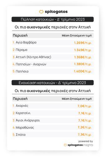 Η πιο ακριβή περιοχή της Αττικής για ενοικίαση αλλά και αγορά κατοικίας είναι η Βουλιαγμένη στα Νότια Προάστια, με μέση ζητούμενη τιμή 18,1€/τ.μ. και 6.488€/τ.μ. αντίστοιχα. Η περιοχή Κολωνάκι - Λυκαβηττός και η Γλυφάδα επίσης κατατάσσονται στις ακριβότερες περιοχές της Αττικής για ενοικίαση και για αγορά κατοικίας. Αντίθετα, στις οικονομικότερες περιοχές για ενοικίαση κατοικίας περιλαμβάνονται οι Αχαρνές και το Κερατσίνι, ενώ για αγορά κατοικίας η Αγία Βαρβάρα και το Πέραμα. Στη Θεσσαλονίκη, οι ακριβότερες περιοχές για αγορά κατοικίας είναι η Καλαμαριά (2.765€/τ.μ.) και το κέντρο της Θεσσαλονίκης (2.593€/τ.μ.), ενώ για ενοικίαση είναι και πάλι το κέντρο της Θεσσαλονίκης (9,4€/τ.μ.) και η περιοχή Βαρδάρης – Λαχανόκηποι, με μέση ζητούμενη τιμή ενοικίασης 9,0€/τ.μ..