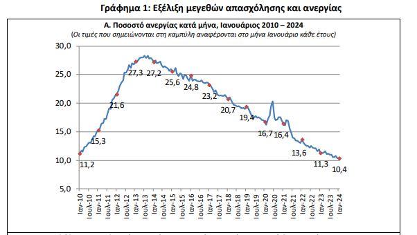 Στο 10,4% διαμορφώθηκε το ποσοστό της ανεργίας στη χώρα τον Ιανουάριο φέτος, έναντι 11,3% τον Ιανουάριο 2023 και του αναθεωρημένου προς τα άνω 10,4% τον Δεκέμβριο 2023. Οι άνεργοι ανήλθαν σε 495.132 άτομα, σημειώνοντας μείωση κατά 34.245 άτομα σε σχέση με τον Ιανουάριο 2023 (6,5%) και αύξηση κατά 1.741 άτομα σε σχέση με τον Δεκέμβριο 2023 (0,4%).