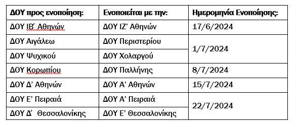 Για την υλοποίηση του σχεδιασμού αυτού, με απόφαση του Διοικητή της ΑΑΔΕ ενοποιούνται οι παρακάτω ΔΟΥ Αττικής και Θεσσαλονίκης με όμορη χωρική αρμοδιότητα, ως εξής: