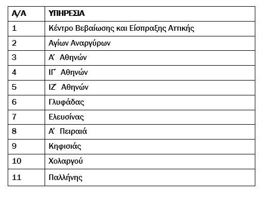 Περαιτέρω, λαμβάνοντας υπόψη τις ημερήσιες συναλλαγές ταμείου στις ΔΟΥ της Αττικής, μετά τη σύσταση του Κέντρου Βεβαίωσης και Είσπραξης Αττικής, με Απόφαση του Διοικητή της ΑΑΔΕ, από τις 26 Μαρτίου 2024, θα παρέχονται υπηρεσίες ταμείου για την έκδοση διπλοτύπου παραστατικού είσπραξης τύπου Α’ αποκλειστικά από τις παρακάτω υπηρεσίες: