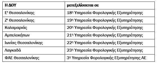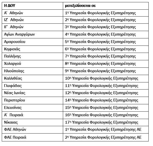 Με την ολοκλήρωση της μετάβασης στο νέο λειτουργικό και οργανωτικό μοντέλο, οι ΔΟΥ που μετεξελίσσονται σε Υπηρεσίες Φορολογικής Εξυπηρέτησης είναι οι ακόλουθες: