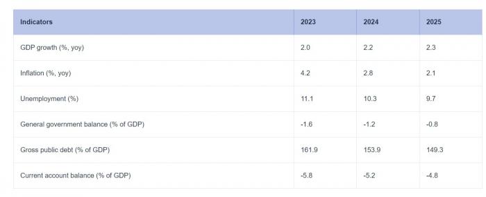Ο πληθωρισμός στην Ελλάδα αναμένεται να μετριαστεί στο 2,8% το 2024 και στο 2,1% το 2025, δηλαδή στο ίδιο επίπεδο με την ευρωζώνη. Το έλλειμμα της γενικής κυβέρνησης αναμένεται να συρρικνωθεί περαιτέρω, χάρη στη συγκρατημένη αύξηση των δαπανών και ο λόγος του δημόσιου χρέους αναμένεται να παραμείνει σε πτωτική πορεία.