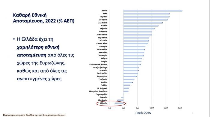Η Ελλάδα έχει τη χαμηλότερη εθνική αποταμίευση ως ποσοστό του ΑΕΠ από όλες τις χώρες της Ευρωζώνης, καθώς και από όλες τις ανεπτυγμένες χώρες. Το ποσοστό αποταμίευσης των νοικοκυριών στην Ελλάδα είναι σημαντικά χαμηλότερο από τα αντίστοιχα της Ισπανίας, της Πορτογαλίας και της Ιταλίας, καθώς επίσης και της Ευρωζώνης.