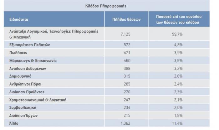 Στην Πληροφορική η μεγαλύτερη ζήτηση για κάλυψη θέσεων εργασίας υπάρχει στην ειδικότητα Ανάπτυξης Λογισμικού, Τεχνολογιών Πληροφορικής και Μηχανικής που φτάνει το 59,7%. Το 13% αφορά την πελατοκεντρικής στρατηγικής των επιχειρήσεων, με την ζήτηση να καταγράφεται για θέσεις Εξυπηρέτησης Πελατών (4,8%), Πωλήσεων (3,9%) και Μάρκετινγκ και Επικοινωνίας (3,9%). Ενδιαφέρουσα τάση είναι και η ανάδειξη της ειδικότητας Ανάλυσης Δεδομένων (3,2%) για προσφορά υπηρεσιών επιχειρηματικής αναλυτικής (business analytics), ενώ στο 2,6% είναι η ειδικότητα Δημιουργικό που αναφέρεται στη στελέχωση σχετικών τμημάτων (creative), και αφορούν κυρίως το ψηφιακό μάρκετιγκ και ηλεκτρονικό εμπόριο.
