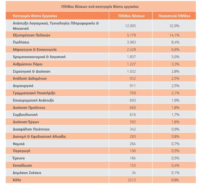 Ειδικότερα, υπάρχουν 12.095 θέσεις εργασίας στην Ανάπτυξη Λογισμικού, Τεχνολογιών Πληροφορικής και Μηχανικής κατέχοντας το 32,9% του συνόλου, με την Εξυπηρέτηση Πελατών να ακολουθεί με 14,1% και 5.179 θέσεις εργασίας, οι Πωλήσεις με 8,4% και 3.083 θέσεις, στο Μάρκετινγκ/Επικοινωνίας που έχει το 6,6% με 2.428 θέσεις εργασίας και των Χρηματοοικονομικών/Λογιστικής που με 1.837 θέσεις εργασίας έχει το 5% του συνόλου.