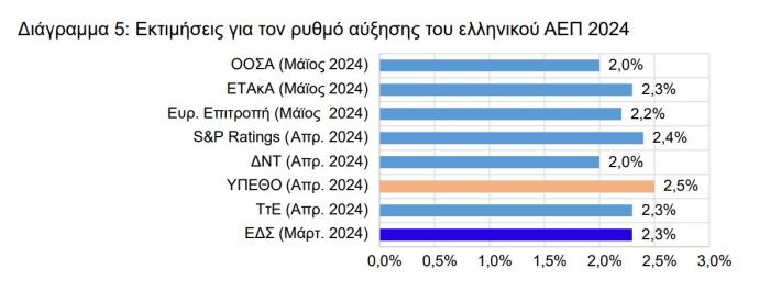 Ειδικότερα, το ΕΔΣ προβλέπει ότι η αύξηση του πραγματικού ΑΕΠ θα είναι 2,3%, ελαφρώς πιο συντηρητική δηλαδή από την πρόβλεψη του ΥΠΕΘΟ (2,5%). Ελαφρώς πιο συντηρητικές εκτιμήσεις από το ΥΠΕΘΟ παρουσιάζει η ΤτΕ εκτιμώντας ότι η μεγέθυνση θα είναι 2,3%. Αναφορικά με τους διεθνείς οργανισμούς, οι πιο πρόσφατες προβλέψεις (Μάιος 2024) του ΟΟΣΑ προβλέπουν μεγέθυνση της τάξης του 2,0%, ενώ οι εκτιμήσεις του Μαΐου της Ευρωπαϊκής Τράπεζας Ανασυγκρότησης και Ανάπτυξης, καθώς και της Ευρωπαϊκής Επιτροπής, προβλέπουν μεγέθυνση 2,3%. Λιγότερο αισιόδοξο το ΔΝΤ εκτιμά πως η ελληνική οικονομία θα έχει μεγέθυνση 2,0% κατά το 2024.