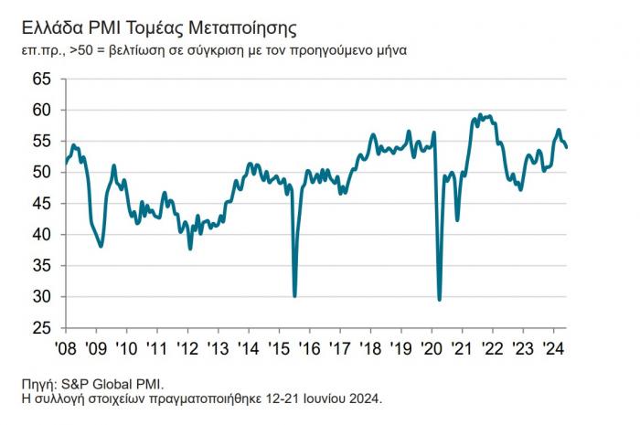 Όπως αναφέρει σε έκθεσή της η S&P Global οι Έλληνες κατασκευαστές υπέδειξαν ακόμα μία σταθερή μηνιαία αύξηση κατά τη διάρκεια του Ιουνίου, σύμφωνα με τα τελευταία στοιχεία της έρευνας PMI. Οι λειτουργικές συνθήκες εξακολούθησαν να βελτιώνονται με ιστορικά υψηλούς ρυθμούς, καθώς η παραγωγή και οι νέες παραγγελίες αυξήθηκαν περαιτέρω. Ωστόσο, οι ρυθμοί αύξησης της παραγωγής, των νέων πωλήσεων και των αγορών εισροών εξασθένησαν στους βραδύτερους που έχουν καταγραφεί από τον Δεκέμβριο του 2023, ενώ η επιχειρηματική εμπιστοσύνη υποχώρησε στο ασθενέστερο επίπεδο που έχει καταγραφεί το 2024 μέχρι σήμερα.