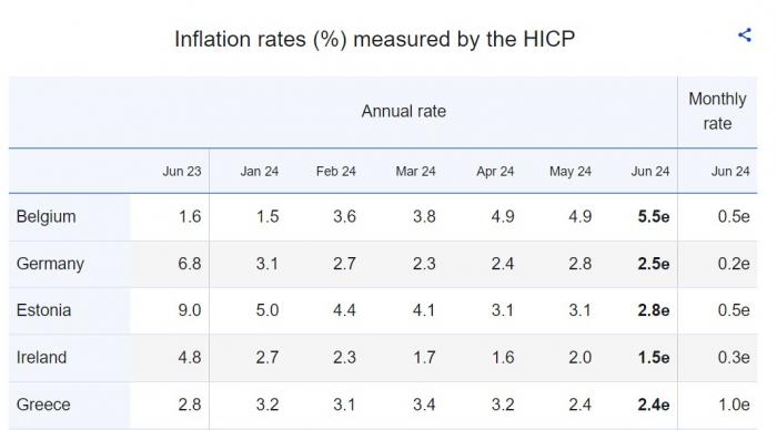 Αμετάβλητος στο 2,4% παρέμεινε τον Ιούνιο για την Ελλάδα ο Εναρμονισμένος Δείκτης Τιμών Καταναλωτή τον Ιούνιο, σύμφωνα με την εκτίμηση της Eurostat, με αυτόν για το σύνολο της ευρωζώνης να υποχωρεί στο 2,5% από 2,6% που ήταν τον προηγούμενο μήνα, πλήρως ευθυγραμμισμένος με τις εκτιμήσεις των αναλυτών.