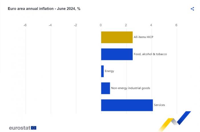 Παράλληλα η Eurostat επισημαίνει ότι όσον αφορά τις κύριες συνιστώσες του πληθωρισμού της ζώνης του ευρώ, οι υπηρεσίες αναμένεται να έχουν τον υψηλότερο ετήσιο ρυθμό τον Ιούνιο (4,1%, σταθερός σε σύγκριση με τον Μάιο), ακολουθούμενες από τα τρόφιμα, το αλκοόλ και τον καπνό (2,5%, σε σύγκριση με 2,6% τον Μάιο), τα μη ενεργειακά βιομηχανικά αγαθά (0,7%, σταθερός σε σύγκριση με τον Μάιο) και την ενέργεια (0,2%, σε σύγκριση με 0,3% τον Μάιο).