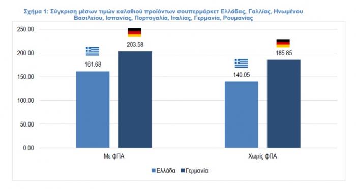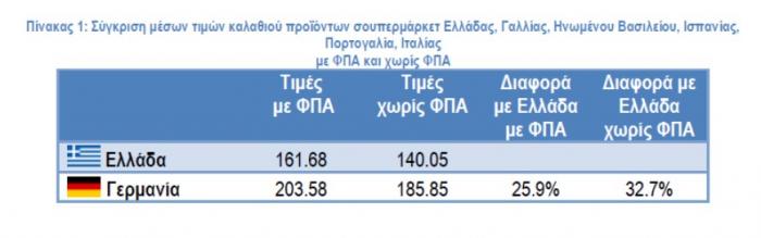 Η σύγκριση των μέσων τιμών των καλαθιών (πίνακας 1) δείχνει ότι η Γερμανία έχει ακριβότερο καλάθι κατά 26%. Η εικόνα των αποτελεσμάτων αλλάζει σημαντικά όταν αφαιρέσουμε τον αναλογούντα ΦΠΑ ανά χώρα για να γίνουν αντιληπτές τις πραγματικές τιμές των προϊόντων σουπερμάρκετ. Η σύγκριση των καλαθιών σε αυτή την περίπτωση (σχήμα 1 και πίνακας 1) η Γερμανία έχει ακριβότερο καλάθι κατά 33%. Αυτό είναι αποτέλεσμα της διαφοράς που έχει ο χαμηλός ΦΠΑ ανά χώρα (πρόκειται για τον ΦΠΑ που αναφέρεται σε τρόφιμα και ποτά). Στην Ελλάδα αυτός ο ΦΠΑ είναι 13% ενώ στην Γερμανία (7%).