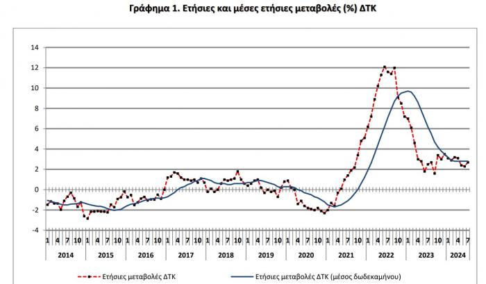 Σημαντική αύξηση σημείωσε ο πληθωρισμός τον Ιούλιο καθώς διαμορφώθηκε στο 2,7% από 2,3% που ήταν τον προηγούμενο μήνα και 2,5% τον Ιούλιο του 2023, με τον τομέα των υπηρεσιών να είναι αυτός που αναλαμβάνει τα ηνία της στήριξης των πληθωριστικών πιέσεων από τον κλάδο των τροφίμων.
