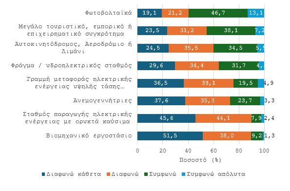 Αξίζει να σημειωθεί ότι η αποδοχή των συμβατικών μορφών παραγωγής ηλεκτρικής ενέργειας με ορυκτά καύσιμα, καθώς και των νέων τεχνολογιών πυρηνικής ενέργειας, είναι ακόμα χαμηλότερη σε σύγκριση και με τα αιολικά πάρκα. Ειδικότερα, το 43% και το 26% των πολιτών θεωρεί ως αρκετά ή απολύτως κατάλληλη για την Ελλάδα την παραγωγή ηλεκτρικής ενέργειας με φυσικό αέριο ή καύση εγχώριου λιγνίτη αντίστοιχα, ενώ για τα πυρηνικά η αντίληψη καταλληλότητας υποχωρεί στο 17% του δείγματος. Μόλις το 9,6% των πολιτών θα συμφωνούσε στην εγκατάσταση σταθμού παραγωγής ηλεκτρικής ενέργειας με ορυκτά καύσιμα και το 71% δεν θα συμφωνούσε με την εγκατάσταση του σταθμού ανεξαρτήτως του ποσού αποζημίωσης.