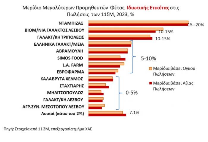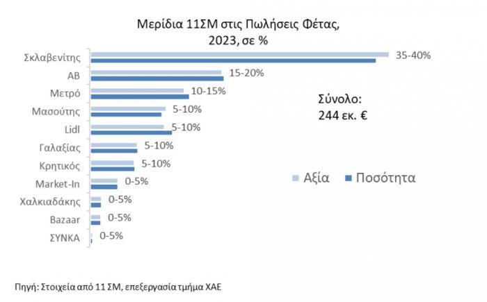 Το 2023, με βάση την αξία πωλήσεων στα επώνυμα προϊόντα φέτας το μεγαλύτερο μερίδιο στα σούπερ μάρκετ έχει ο Σκλαβενίτης (40-45%) και ακολουθούν τα Metro (10-15%), το ΑΒ Βασιλόπουλος (10-15%) και η Μασούτης (10-15%). Μερίδιο μεταξύ 5% έως 10% κατέχει ο Γαλαξίας, και ο Κρητικός. Μερίδιο κάτω του 5% τα MARKET-IN, Χαλκιαδάκης, LIDL, BAZAAR, ΣΥΝΚΑ.