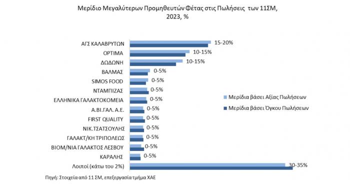 Ως προς την εξέλιξη των μεριδίων των τριών μεγαλύτερων προμηθευτών φέτας κατά την περίοδο που έγινε η έρευνα (1/2/2023 - 30/6/2024) το ποσοστό της Συνεταιρισμού Καλαβρύτων κυμάνθηκε μεταξύ 15-20% κατά την περίοδο αναφοράς, η «Όπτιμα» αύξησε το μερίδιο της από περίπου 5-10% σε περίπου 10-15% παρουσιάζοντας όμως διακυμάνσεις. Αντίθετα, το μερίδιο της «Δωδώνη» μειώθηκε από περίπου 10-15% στο 5-10%.