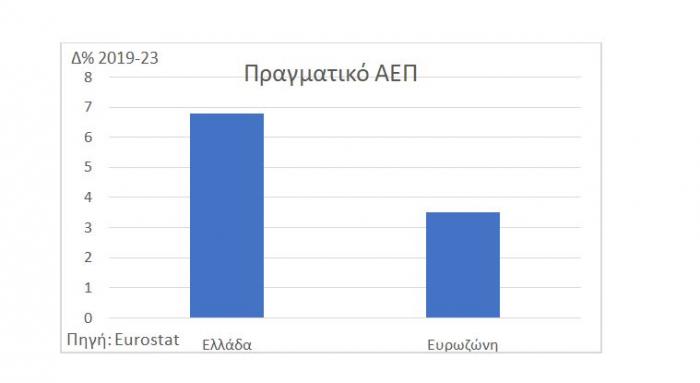 4. Σωρευτικά είχαμε 6,8% ανάπτυξη του πραγματικού ΑΕΠ 2019-23 έναντι 5,8% προηγουμένως. Σημειώνεται ότι η Ευρωζώνη είχε ανάπτυξη του πραγματικού ΑΕΠ 3,5% το ίδιο διάστημα, δηλαδή λιγότερο από το μισό της Ελλάδας, και η ΕΕ-27 είχε ρυθμό 4%.