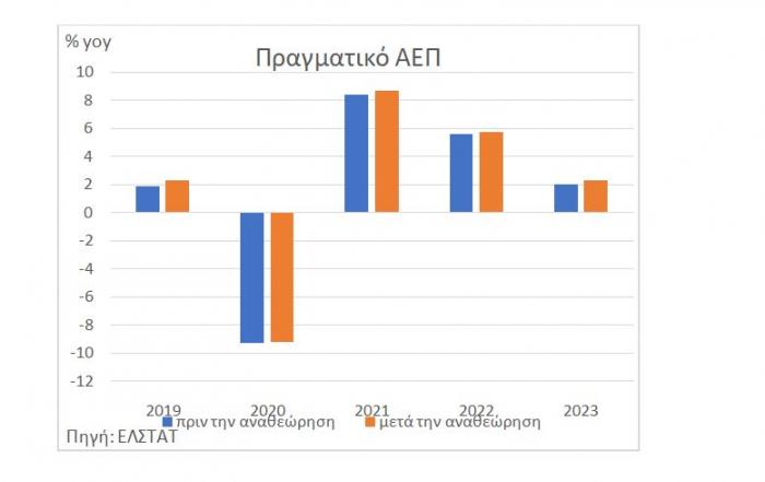 1. Η πραγματική μεγέθυνση ΑΕΠ για το 2023 αναθεωρείται στο 2,3% από 2%. Το ονομαστικό ΑΕΠ αναθεωρείται σωρευτικά 5 δισ. ευρώ πάνω, στα 225,2 δισ. ευρώ το 2023 από 220,3 δισ. ευρώ προηγουμένως.