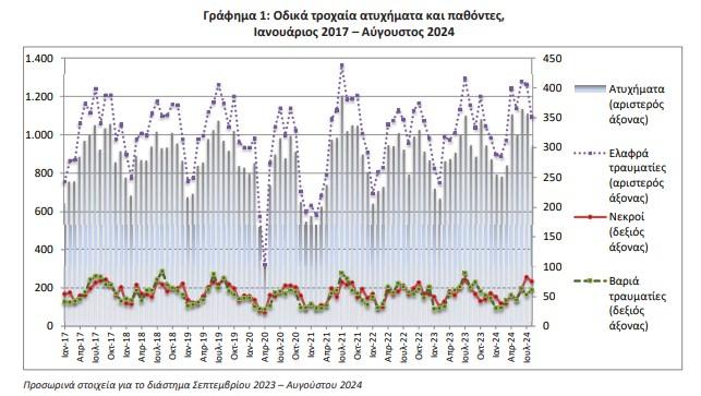 Ειδικότερα, τα Οδικά Τροχαία Ατυχήματα, που συνέβησαν σε ολόκληρη τη Χώρα και προκάλεσαν τον θάνατο ή τον τραυματισμό ατόμων, μειώθηκαν κατά 0,3% σε σύγκριση με τον αντίστοιχο μήνα του 2023 (943 τον Αύγουστο του 2024, έναντι 946 τον Αύγουστο του 2023).