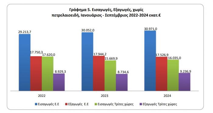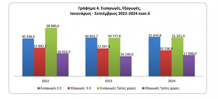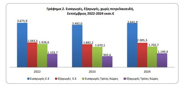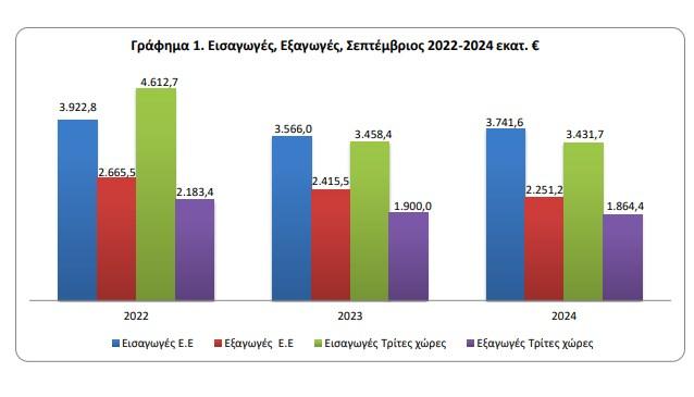 Το έλλειμμα του εμπορικού ισοζυγίου κατά το χρονικό διάστημα Ιανουαρίου-Σεπτεμβρίου 2024 ανήλθε σε 25.130,2 εκατ. ευρώ (26.981,9 εκατ. δολάρια) έναντι 23.153,6 εκατ. ευρώ (24.761,0 εκατ. δολάρια) κατά το ίδιο διάστημα του έτους 2023, παρουσιάζοντας αύξηση, σε ευρώ, 8,5%. Το αντίστοιχο μέγεθος χωρίς τα πετρελαιοειδή παρουσίασε αύξηση κατά 1.199,1 εκατ. ευρώ, δηλαδή 6,3% και το αντίστοιχο μέγεθος χωρίς τα πετρελαιοειδή και τα πλοία παρουσίασε αύξηση κατά 1.150,1 εκατ. ευρώ, δηλαδή 6,1%.