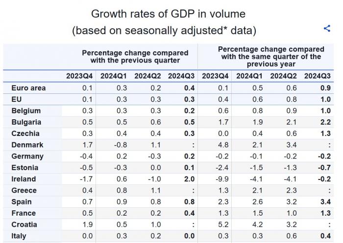 Σε ό,τι αφορά το σύνολο της ευρωζώνης η Eurostat εκτιμά ότι το τρίτο τρίμηνο του 2024, το εποχικά διορθωμένο ΑΕΠ αυξήθηκε κατά 0,4% στη ζώνη του ευρώ και κατά 0,3% στην ΕΕ, σε σύγκριση με το προηγούμενο τρίμηνο, σύμφωνα με την πρόωρη εκτίμηση που δημοσίευσε η Eurostat, η στατιστική υπηρεσία της Ευρωπαϊκής Ένωσης. Το δεύτερο τρίμηνο του 2024, το ΑΕΠ είχε αυξηθεί κατά 0,2% στη ζώνη του ευρώ και κατά 0,3% στην ΕΕ.