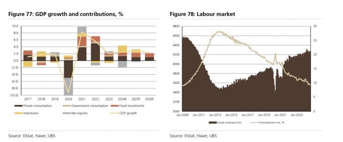 Παράγοντας στήριξης για την οικονομία παραμένουν τα κεφάλαια του Ταμείου Ανάκαμψης, ενώ η ελβετική τράπεζα σημειώνει ότι η αύξηση του ΑΕΠ το α’ εξάμηνο του 2024 ήταν κατά μέσο όρο 2,2% ετησίως, λόγω της αύξησης των επενδύσεων κατά 3,5% ετησίως, ενώ η κατανάλωση εμφάνισε άνοδο 2%, λόγω και της ενίσχυσης του πραγματικού εισοδήματος. Εκτιμά ότι για φέτος η ανάπτυξη θα κινηθεί κοντά στο 2,5%, με στήριξη και από την αύξηση των δανείων κατά 11% στο γ’ τρίμηνο, τον τουρισμό αλλά και την αγορά εργασίας.