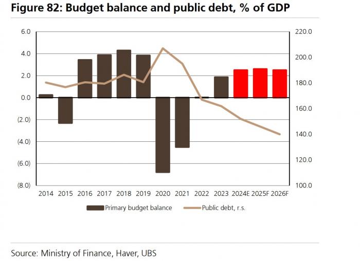 Με δεδομένα τα παραπάνω η UBS εκτιμά ότι ο δείκτη του δημόσιου χρέους προς το ΑΕΠ θα μειωθεί περαιτέρω και γρήγορα: εκτιμά ότι θα διαμορφωθεί στο 152% του ΑΕΠ φέτος στο 146% του ΑΕΠ το 2025 και στο 140% του ΑΕΠ το 2026. Οι εκτιμήσεις της κυβέρνησης είναι κάπως πιο συντηρητικές. στο 143% για το 2026.
