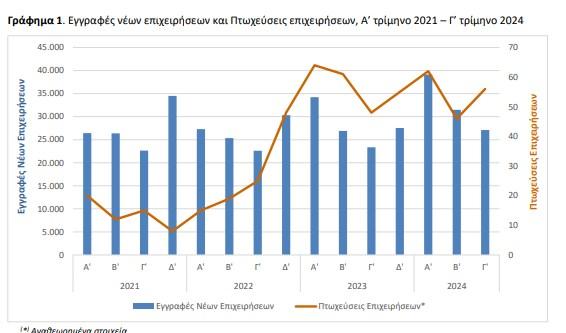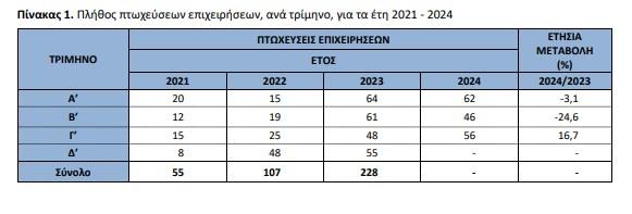 Οι πτωχεύσεις επιχειρήσεων, για το σύνολο των τομέων της οικονομίας, το γ’ τρίμηνο 2024 ανήλθαν σε 56, παρουσιάζοντας αύξηση 16,7% σε σχέση με το γ’ τρίμηνο 2023 που είχαν ανέλθει σε 48.