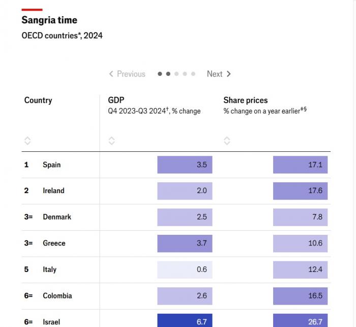 Στην κορυφαία πεντάδα των οικονομιών που ακολούθησαν πολύ καλή πορεία το 2024 συμπεριλαμβάνει την ελληνική ο Economist, στην τακτική ετήσια έρευνά του μεταξύ όλων των χωρών της υφηλίου.
