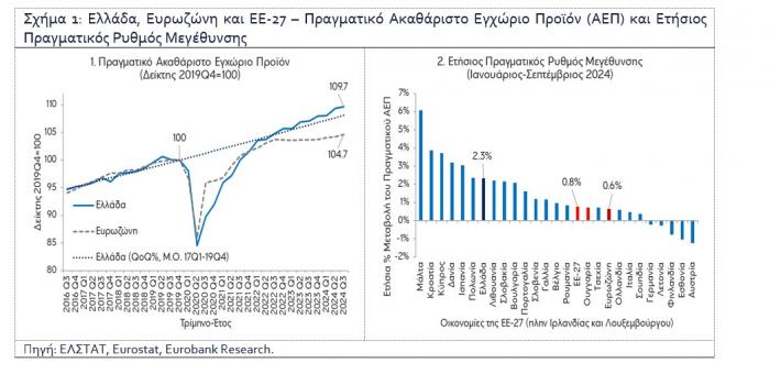 Στο 9μηνο Ιανουαρίου-Σεπτεμβρίου 2024 ο ετήσιος πραγματικός ρυθμός μεγέθυνσης στην Ελλάδα διαμορφώθηκε στο 2,3% (βλέπε Σχήμα 1.2 και Πίνακα 1) και ήταν ο 5ος υψηλότερος στην Ευρωζώνη και ο 7ος υψηλότερος στην ΕΕ-27. Στην πρώτη θέση ήταν η Μάλτα (6,1%) και ακολούθησαν (πλην Ιρλανδίας και Λουξεμβούργου): Κροατία (3,9%), Κύπρος (3,7%), Δανία (3,2%), Ισπανία (3,0%), Πολωνία (2,4%), Ελλάδα (2,3%), Λιθουανία (2,2%), Σλοβακία (2,1%), Βουλγαρία (2,1%), Πορτογαλία (1,6%), Σλοβενία (1,2%), Γαλλία (1,2%), Βέλγιο (1,0%), Ρουμανία (0,8%), ΕΕ-27 (0,8%), Ουγγαρία (0,7%), Τσεχία (0,7%), Ευρωζώνη (0,6%), Ολλανδία (0,6%), Ιταλία (0,5%), Σουηδία (0,4%), Γερμανία (-0,2%), Λετονία (-0,3%), Φινλανδία (-0,8%), Εσθονία (-1,0%) και Αυστρία (-1,2%).