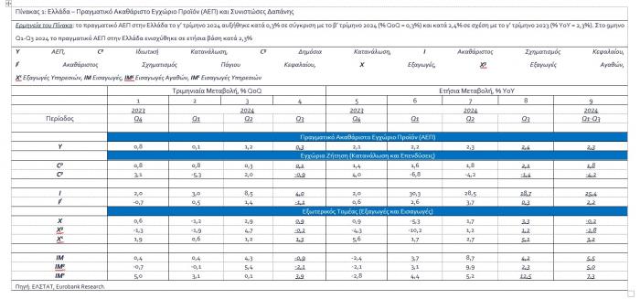 Εν κατακλείδι, ο ετήσιος πραγματικός ρυθμός μεγέθυνσης στην Ελλάδα το γ’ τρίμηνο 2024 και το 9μηνο Ιανουαρίου-Σεπτεμβρίου 2024 διατηρήθηκε σε ικανοποιητικά επίπεδα (οριακά υψηλότερος από την πρόβλεψη του Κρατικού Προϋπολογισμού 2025 για την ανάπτυξη του 2024), υπεραποδίδοντας έναντι της Ευρωζώνης και της ΕΕ-27. Από την πλευρά της ζήτησης, η μεταβολή των αποθεμάτων (υλικά και προμήθειες, έργα σε εξέλιξη, έτοιμα προϊόντα και εμπορεύματα για μεταπώληση) και η ιδιωτική κατανάλωση αποτέλεσαν τις βασικές συνιστώσες της ανάπτυξης, ενώ από την πλευρά της προσφοράς, η βιομηχανία και οι υπηρεσίες είχαν την υψηλότερη συνεισφορά στην αύξηση της παραγωγής. Στα αρνητικά στοιχεία των εθνικών λογαριασμών του 9μηνου Ιανουαρίου-Σεπτεμβρίου 2024 συγκαταλέγονται: πρώτον, η μείωση των εξαγωγών (λόγω της συνιστώσας των αγαθών) και η διεύρυνση του εμπορικού ελλείμματος, και δεύτερον, η ήπια άνοδος των επενδύσεων παγίων.