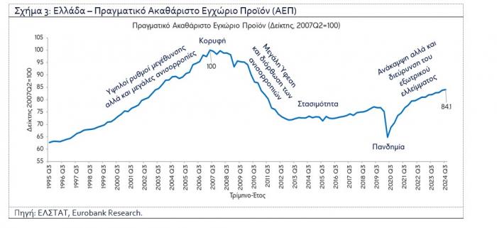 Η ελληνική οικονομία συνέχισε να αναπτύσσεται με ικανοποιητικό ρυθμό το γ’ τρίμηνο 2024, υπεραποδίδοντας έναντι της ευρωζώνης, όπως υπογραμμίζει η Eurobank, στην τακτική εβδομαδιαία έκθεσή της η «7 Ημέρες Οικονομία».