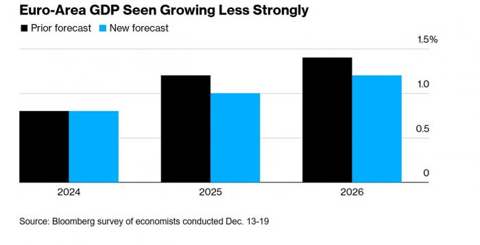 Στο 1% υποβαθμίζουν την εκτίμησή τους για την ανάπτυξη της ευρωζώνης το 2025 σε έρευνα του Bloomberg από 1,2% προηγούμενης πρόβλεψης. Εκτιμάται ότι θα διαμορφωθεί στο 1,2% το 2026.