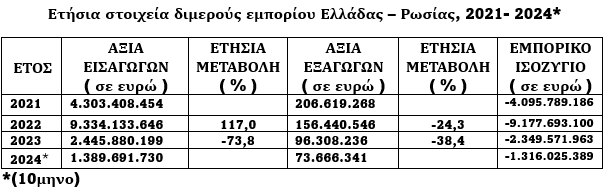 Πιο συγκεκριμένα, την περίοδο Ιανουαρίου-Οκτωβρίου 2024 (προσωρινά στοιχεία) η αξία των εισαγωγών της Ελλάδας από τη Ρωσία ανήλθε σε 1,39 δισ. ευρώ, σημειώνοντας μείωση 39,8% σε σχέση με την περίοδο Ιανουαρίου-Οκτωβρίου 2023 που ήταν 2,3 δισ. ευρώ. Η αξία των εξαγωγών της Ελλάδας προς τη Ρωσία την περίοδο Ιανουαρίου-Οκτωβρίου 2024 ανήλθε σε 73,7 εκατ. ευρώ, σημειώνοντας μείωση 8,7% σε σχέση με την περίοδο Ιανουαρίου-Οκτωβρίου 2023 που ήταν 80,7 εκατ. ευρώ. Το εμπορικό ισοζύγιο Ελλάδας-Ρωσίας την περίοδο Ιανουαρίου-Οκτωβρίου 2024 ήταν αρνητικό και ανήλθε σε 1,32 δισ. ευρώ.