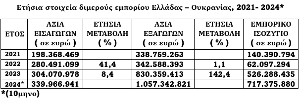 Την περίοδο Ιανουαρίου-Οκτωβρίου 2024 η αξία των εισαγωγών της Ελλάδας από την Ουκρανία ανήλθε σε 340 εκατ. ευρώ, σημειώνοντας αύξηση 42,2% σε σχέση με την περίοδο Ιανουαρίου-Οκτωβρίου 2023 που ήταν 239 εκατ. ευρώ. Η αξία των εξαγωγών της Ελλάδας προς την Ουκρανία την περίοδο Ιανουαρίου-Οκτωβρίου 2024 ανήλθε σε 1,06 δισ. ευρώ, σημειώνοντας αύξηση 68,2% σε σχέση με την περίοδο Ιανουαρίου-Οκτωβρίου 2023 που ήταν 628,8 εκατ. ευρώ. Το εμπορικό ισοζύγιο Ελλάδας-Ουκρανίας την περίοδο Ιανουαρίου-Οκτωβρίου 2024 ήταν θετικό και ανήλθε σε πλεόνασμα 717,4 εκατ. ευρώ.