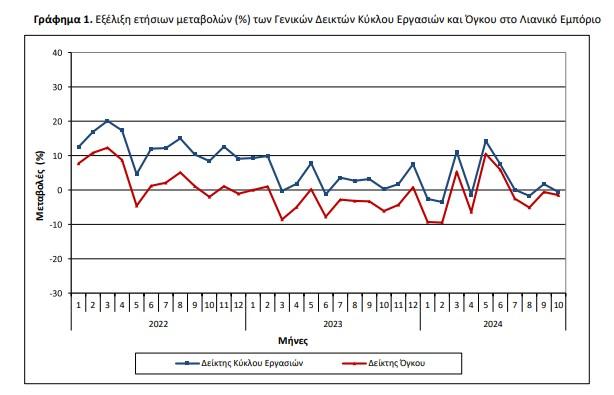 - Ο Γενικός Δείκτης Όγκου (κύκλος εργασιών σε σταθερές τιμές), κατά τον μήνα Οκτώβριο 2024, σε σύγκριση με τον αντίστοιχο δείκτη του Οκτωβρίου 2023, παρουσίασε μείωση 1,5% και σε σύγκριση με τον αντίστοιχο δείκτη του Σεπτεμβρίου 2024 μείωση 4,0%.