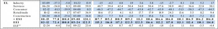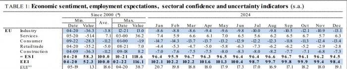 Η Κομισιόν τονίζει ότι η υποχώρηση του δείκτη ESI οφείλεται στη μείωση της εμπιστοσύνης στη βιομηχανία, τις κατασκευές και μεταξύ των καταναλωτών, η οποία αντισταθμίστηκε εν μέρει από την αύξηση της εμπιστοσύνης στις υπηρεσίες. Η εμπιστοσύνη στο λιανικό εμπόριο παρέμεινε σε γενικές γραμμές σταθερή. Όσον αφορά τις μεγαλύτερες οικονομίες της ΕΕ, ο ESI μειώθηκε αισθητά στη Γαλλία (-3 μονάδες), τη Γερμανία (-2,5 μονάδες) και την Ιταλία (-1,1 μονάδες), ενώ βελτιώθηκε στην Ισπανία (+0,9 μονάδες). Η εμπιστοσύνη παρέμεινε σε γενικές γραμμές αμετάβλητη στην Πολωνία (+0,1 μονάδες) και Ολλανδία (-0,2 μονάδες).
