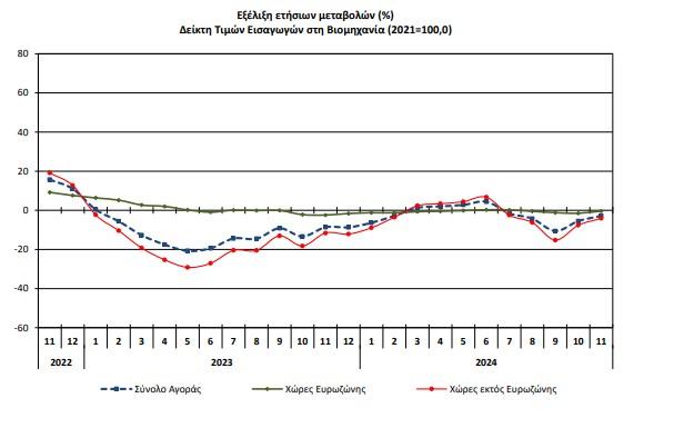 Ο Γενικός Δείκτης Τιμών Εισαγωγών στη Βιομηχανία, τον Νοέμβριο 2024, σε σύγκριση με τον αντίστοιχο δείκτη Νοεμβρίου 2023, παρουσίασε μείωση 2,8% έναντι μείωσης 8,6% που σημειώθηκε κατά τη σύγκριση των αντίστοιχων δεικτών του έτους 2023 με το 2022.