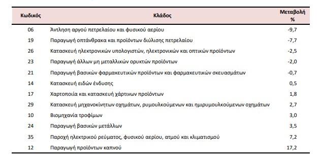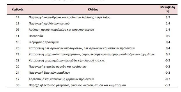 Στην αύξηση του Γενικού Δείκτη Τιμών Εισαγωγών (σύνολο αγοράς) κατά 0,5%, συνέβαλαν κυρίως οι μεταβολές των δεικτών των διψήφιων κλάδων της ταξινόμησης NACE Αναθ. 2, ως εξής: