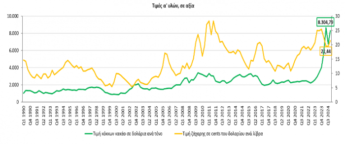 Το κακάο και η ζάχαρη είναι χρηματιστηριακά προϊόντα. Οι τιμές του κακάο και της ζάχαρης ακολουθούν τόσο τους μεγάλους κύκλους των τιμών των εμπορευμάτων (commodity supercycles) με ανοδικές και καθοδικές δεκαετίες, όσο και μικρότερους κύκλους ανάλογα με τις οικονομικές και καιρικές συνθήκες. Σημειώνεται ότι η τιμή του κακάο αυξήθηκε ραγδαία, με Μέσο Ετήσιο Ρυθμό Μεταβολής (ΜΕΡΜ) 45% την τριετία 2022-2024.