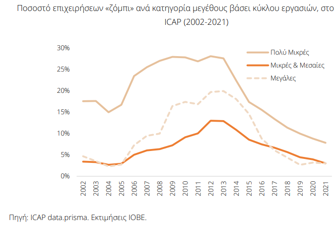 Το εκτιμώμενο ποσοστό των επιχειρήσεων «ζόμπι» εμφάνισε αύξηση από το 10% έως το 18,6% στο χρονικό διάστημα 2005- 2013 και αποκλιμάκωση έκτοτε, έως και 8,9% το 2022. Σε σχέση με την τάξη μεγέθους των επιχειρήσεων βάσει κύκλου εργασιών, παρατηρείται υψηλότερο ποσοστό «ζόμπι» επιχειρήσεων στις πολύ μικρές επιχειρήσεις, με την τάση να είναι πτωτική μετά το 2013 σε όλες τις τάξεις μεγέθους. Ενδιαφέρον παρουσιάζει το γεγονός ότι στην περίοδο 2005-2016, το ποσοστό των επιχειρήσεων «ζόμπι» ήταν υψηλότερο στις επιχειρήσεις μεγάλου μεγέθους σε σχέση με τις