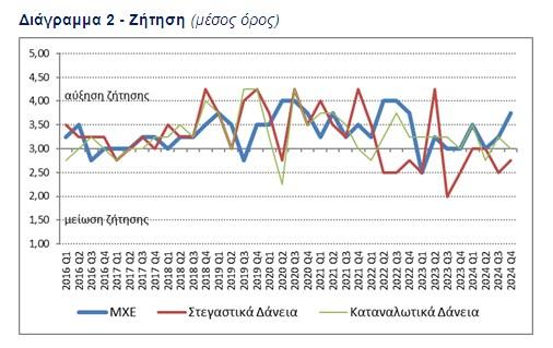 Η ζήτηση για τα στεγαστικά δάνεια παρέμεινε σχεδόν αμετάβλητη, ενώ για τα καταναλωτικά παρέμεινε αμετάβλητη για το δ΄ τρίμηνο του 2024.Για το α΄ τρίμηνο του 2025, η ζήτηση για στεγαστικά δάνεια αναμένεται να αυξηθεί, ενώ για καταναλωτικά δάνεια αναμένεται να παραμείνει αμετάβλητη.