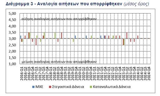 Κατά το δ΄ τρίμηνο του 2024, η αναλογία των αιτήσεων για στεγαστικά και καταναλωτικά δάνεια που απορρίφθηκαν παρέμεινε αμετάβλητη.