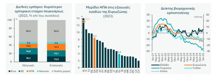 Όμως προσθέτει ότι σημαντικότερες έμμεσες αρνητικές επιδράσεις στο ελληνικό εξαγωγικό εμπόριο θα μπορούσαν να προκύψουν από μια πιθανή επιδείνωση των οικονομικών επιδόσεων βασικών εξαγωγικών μας αγορών στην ΕΕ, σε περίπτωση κλιμάκωσης των πιέσεων στις δικές τους εξαγωγές προς τις ΗΠΑ, λόγω αυξημένων δασμών ή άλλων εναλλακτικών αντισταθμιστικών μέτρων. Συγκεκριμένα, η Ιταλία και η Γερμανία συγκαταλέγονται μεταξύ των κορυφαίων εξαγωγικών μας αγορών και, παράλληλα, έχουν μεγάλη έκθεση στις ΗΠΑ.