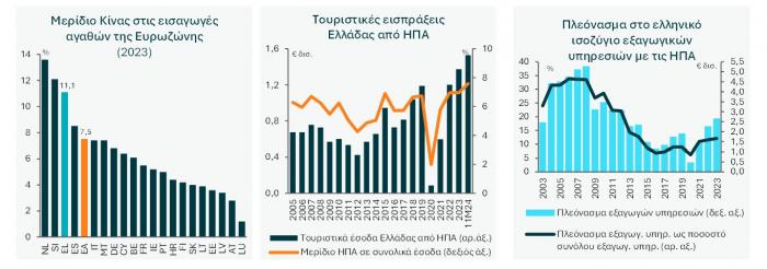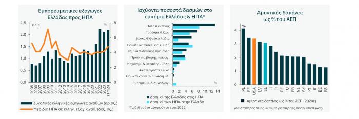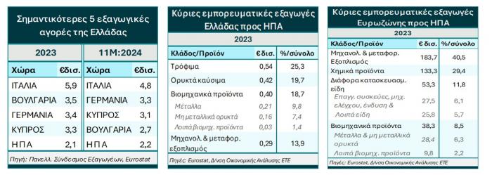 Το μερίδιο των ΗΠΑ στις ελληνικές εμπορευματικές εξαγωγές βρίσκεται σε ανοδική πορεία, σε όρους αξίας, αλλά συνεχίζει να έχει σχετικά μικρή συνεισφορά (περίπου στο 4% επί του συνόλου των ελληνικών εξαγωγών το 2023 − στο 3,3% εξαιρώντας τα ενεργειακά προϊόντα − και στο 4,8% στο 11μηνο του 2024). Αξίζει να τονισθεί ότι το μερίδιο των ΗΠΑ στις ελληνικές εξαγωγές είναι σημαντικά χαμηλότερο σε σύγκριση με την αντίστοιχη βαρύτητα των ΗΠΑ στις εξαγωγές της Ευρωζώνης (8,5% κατά μ.ό.), με την Ιρλανδία (28,2%), την Ιταλία (10,9%), τη Φινλανδία (9,8%), τη Γερμανία (9,7%) και τη Γαλλία (7,9%) να εμφανίζουν την ισχυρότερη άμεση εξαγωγική εξάρτηση από τις ΗΠΑ. Αναφορικά με την κλαδική δομή των ελληνικών εμπορευματικών εξαγωγών προς τις ΗΠΑ, τη μεγαλύτερη συνεισφορά έχουν οι κλάδοι τροφίμων (κυρίως λαχανικά και φρούτα), ορυκτών καυσίμων (πετρελαιοειδών), και βιομηχανικών προϊόντων (κυρίως κατασκευαστικών υλικών και μετάλλων).