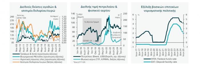 Επίσης, ως αντιστάθμισμα της δυνητικής πληθωριστικής επίδρασης των δασμών και του πιο αδύναμου ευρώ θα μπορούσε να λειτουργήσει η προσπάθεια τρίτων χωρών να διοχετεύσουν στην ευρωπαϊκή αγορά τα προϊόντα τους. Τέλος, η πρόθεση της νέας ηγεσίας των ΗΠΑ να ενθαρρύνει περαιτέρω την εξορυκτική δραστηριότητα εκτιμάται ότι θα συντείνει σε χαμηλότερες διεθνείς ενεργειακές τιμές, σε μεσοπρόθεσμο ορίζοντα, ειδικά αν συνδυαζόταν και με αποκλιμάκωση των γεωπολιτικών εντάσεων.