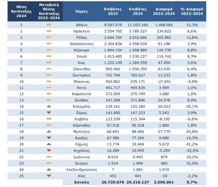 Σύμφωνα με στοιχεία του INSETE, η Ρόδος κατέγραψε διψήφια αύξηση στις διεθνείς αφίξεις σε σύγκριση με το 2023, ενώ ξεχώρισαν τα αεροδρόμια της Μυτιλήνης και της Καλαμάτας καθώς και εκείνο της Αλεξανδρούπολης. Αντιθέτως, εκείνο της Μυκόνου ήταν το μοναδικό που κατέγραψε μείωση των αφίξεων.