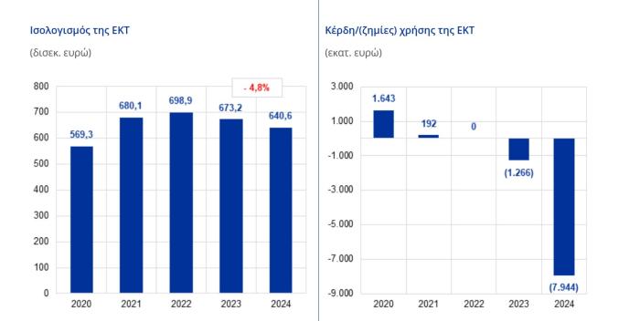 Η ΕΚΤ είναι πιθανόν να καταγράψει ζημίες τα προσεχή έτη. Σε μια τέτοια περίπτωση, τυχόν ζημίες αναμένεται να είναι χαμηλότερες από εκείνες του 2023 και του 2024. Στη συνέχεια, η ΕΚΤ αναμένεται να επανέλθει σε κερδοφορία. Σε κάθε περίπτωση, η ΕΚΤ είναι σε θέση να λειτουργεί αποτελεσματικά και να εκπληρώνει την πρωταρχική της αποστολή να διατηρεί τη σταθερότητα των τιμών ανεξάρτητα από τυχόν ζημίες. Η οικονομική της ευρωστία υπογραμμίζεται περαιτέρω από το κεφάλαιο και τους σημαντικού ύψους λογαριασμούς αναπροσαρμογής της, που συμποσούνται σε 59 δισεκ. ευρώ στο τέλος του 2024, ποσό κατά 13 δισεκ. ευρώ υψηλότερο σε σύγκριση με το τέλος του 2023.