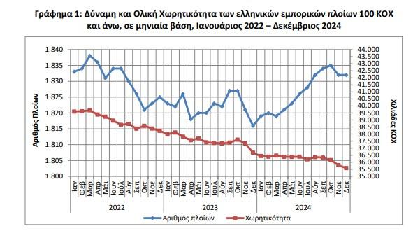 Σύμφωνα επίσης με την ΕΛΣΤΑΤ, η ολική χωρητικότητα του ελληνικού εμπορικού στόλου (πλοία 100 κόρων και άνω) ανήλθε σε 35.586.905 κόρους και παρουσίασε μείωση 3% τον Δεκέμβριο 2024 σε σύγκριση με την αντίστοιχη χωρητικότητα του Δεκεμβρίου 2023, έναντι μείωσης 4% που είχε σημειωθεί κατά την αντίστοιχη σύγκριση του Δεκεμβρίου 2023 προς τον Δεκέμβριο 2022.